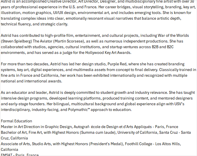 As an educator and leader, Astrid is deeply committed to student growth and industry relevance. She has taught intensive design programs, developed learning platforms, produced training content, and mentored designers and early-stage founders. Her bilingual, multicultural background and global experience align with USV’s interdisciplinary, industry-facing, and Polymathic™ approach to education.